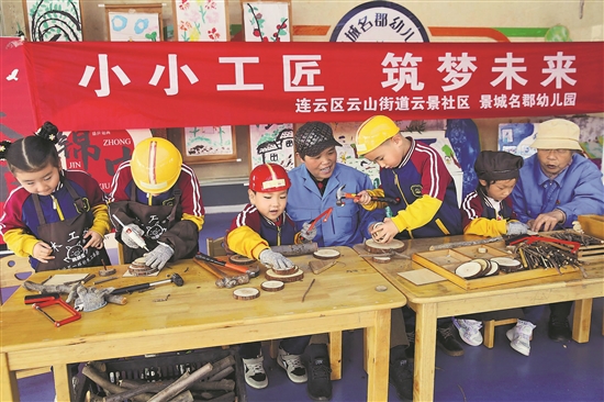 图为在江苏省连云港市云景社区景城名郡幼儿园,工人师傅教孩子使用劳动工具。