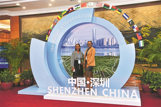 11月6日,两位嘉宾在会场外合影留念。当日,国际红树林中心成立协定在深圳正式签署,首批18个成员国代表共同签署协定并为国际红树林中心揭牌。