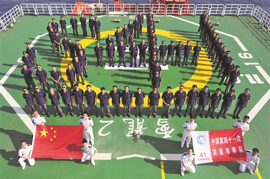 这是考察队队员在“雪龙2”号上排列成“S41”字样的队形合影留念。新华社记者 黄韬铭 摄