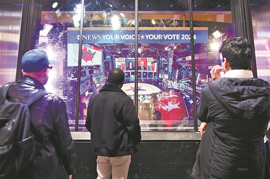 北京时间11月6日,人们在美国纽约时报广场观看实时出口民调。美国媒体测算,共和党总统候选人特朗普已获得至少270张选举人票。 新华社记者 李睿 摄