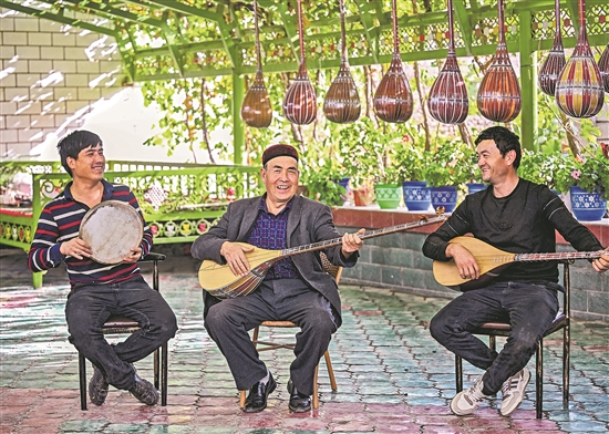 努尔东·司马义(中)和儿子艾合买提·努尔东(左)、徒弟一起演奏乐曲。