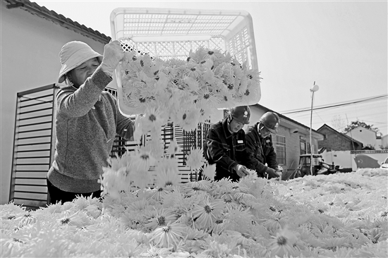 11月6日,河南省许昌市鄢陵县张桥镇裴庄村村民在采收金丝皇菊。