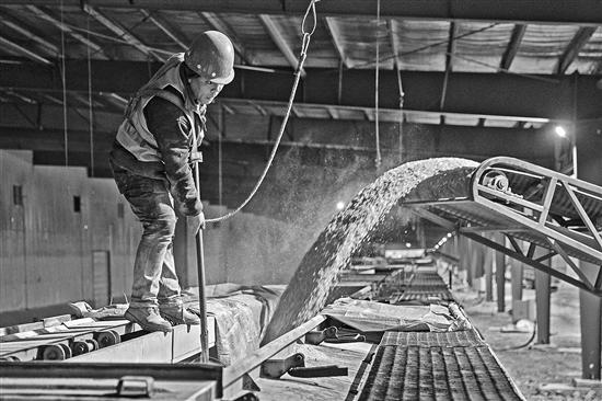 11月5日,在黑龙江省富锦市万里利达粮食储备有限公司专用线上,工人在进行装运作业。