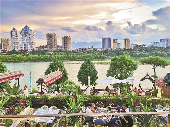 日落时分,在云南省西双版纳州景洪市澜沧江边,游客们边欣赏江景边享受美食。