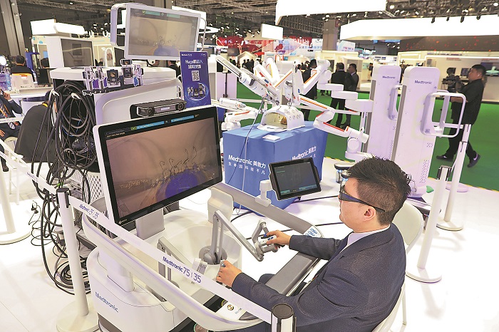 图为第七届进博会医疗器械及医药保健展区,工作人员展示他们的医疗器械。本届进博会期间,11家世界500强制药企业、世界排行前十的医疗器械企业齐聚“四叶草”,涉及放疗、基因检测、体外诊断、跨界数字化诊治、生物医药技术、健康养老等细分领域,不少企业也将最新研发的医疗器械在进博会期间“首发首展”。本报记者 王伟伟 摄