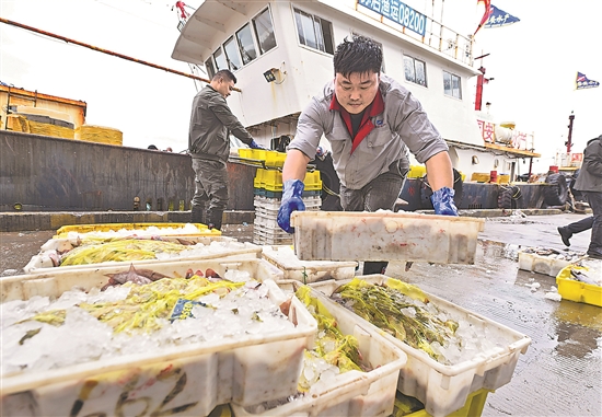 近日,国家级六大中心渔港之一的启东吕四渔港码头一片热闹景象,渔民们忙着卸运、分类处理刚刚到港的多种新鲜海产品。新华社记者 季春鹏 摄
