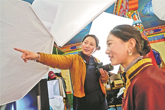 在“钦乐工坊”的摄影棚,达瓦卓玛(左)指导模特如何摆姿势拍摄品牌耳钉饰品(11月4日摄)。