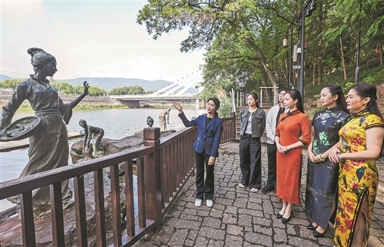 11月12日,在浙江省诸暨市西施故里景区,“金牌推荐官”导游(左一)在给游客介绍西施浣纱雕像。