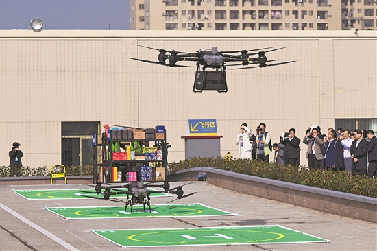 当日,在武汉市汉口北国际贸易城汉口北低空港内,多架装配快递盒的无人机腾跃而起,将海鲜、花卉、服饰等商品送往不同目的地。自此,全国批发市场首个低空物流基地启动常态化运营。