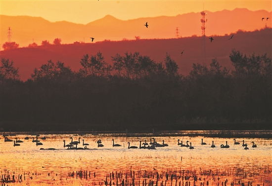 近日,天鹅在河北省张家口市怀来县官厅水库国家湿地公园栖息觅食。