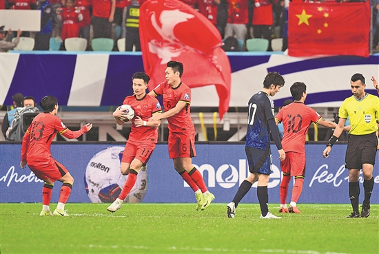 11月19日,中国队球员林良铭(左二)庆祝进球。当日,在福建厦门举行的2026美加墨世界杯亚洲区预选赛18强赛第六轮比赛中,中国队主场1比3不敌日本队。新华社记者 姜克红 摄