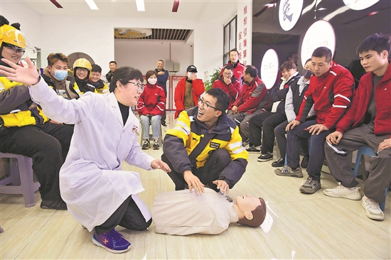 11月19日,在江苏省连云港市云山街道星河社区,医务人员教外卖骑手学习心肺复苏技能。当日,该社区为外卖骑手等新就业形态劳动者开展心肺复苏培训,后续还将培训海姆立克急救法等救护技能,旨在打造一支外卖骑手应急救护队,为市民提供危急时刻的健康安全保障。