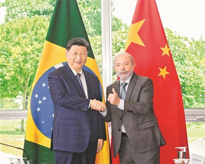 习近平指出,很高兴在中巴建交50周年这个具有重要历史意义的年份访问巴西。刚才卢拉总统为我举行最高礼遇的隆重欢迎仪式,充分体现了对中巴关系的高度重视以及对中国人民的深情厚谊,令我深受感动。中国和巴西是东西半球两大发展中国家。回首过去50年,中巴关系跨越山海,探索出发展中大国相互尊重、互利友好、合作共赢的正确相处之道。巴西是首个同中国建立战略伙伴关系的国家、首个同中国建立全面战略伙伴关系的拉美国家。近年来,在我和卢拉总统战略引领下,两国日益成为命运与共的可靠朋友、共促和平的积极力量,中巴关系正处于历史最好时期,不仅增进了两国人民福祉,也维护了广大发展中国家共同利益,壮大了全球南方的力量和声音,为世界和平稳定作出突出贡献。