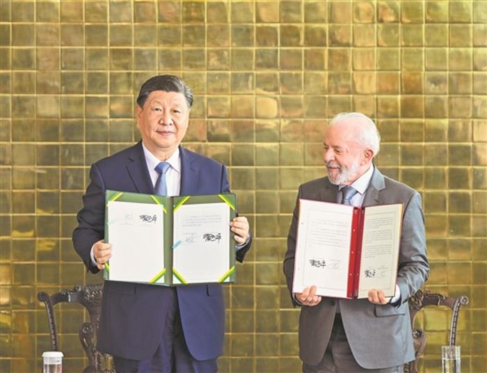 我们就中巴关系未来发展达成新的战略共识,其中最重要的是,我们共同决定将双边关系提升为携手构建更公正世界和更可持续星球的中巴命运共同体,同时将共建“一带一路”倡议同巴西发展战略对接。在世界格局加速演变的背景下,这体现了中巴两个发展中大国识变、应变、求变的决心,必将推动两国关系继往开来、开启下一个“黄金50年”,同时为全球南方国家团结自强树立榜样,为提升发展中国家在全球治理中的代表性和发言权作出新的贡献。