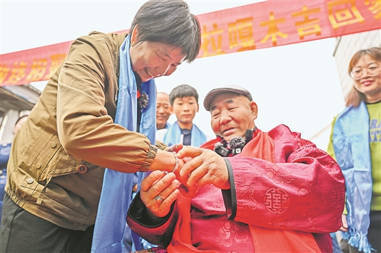 11月16日,扎拉嘎木吉给姐姐戴上他从内蒙古带来的手镯。江苏省南京市溧水区洪蓝街道村民杭巧云迎来了阔别64年的弟弟扎拉嘎木吉。