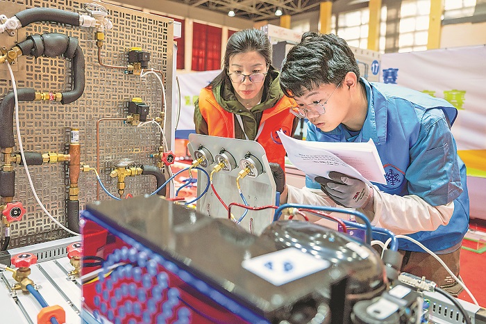11月23日,第四届全国智能楼宇及空调职业技能竞赛制冷空调系统安装维修工赛项决赛在浙江省长兴县职教集团(雉山校区)举行。来自全国各地的96名学生、在校教师和从业人员同台竞技。图为参赛选手进行实操。本报通讯员 谭云俸 摄
