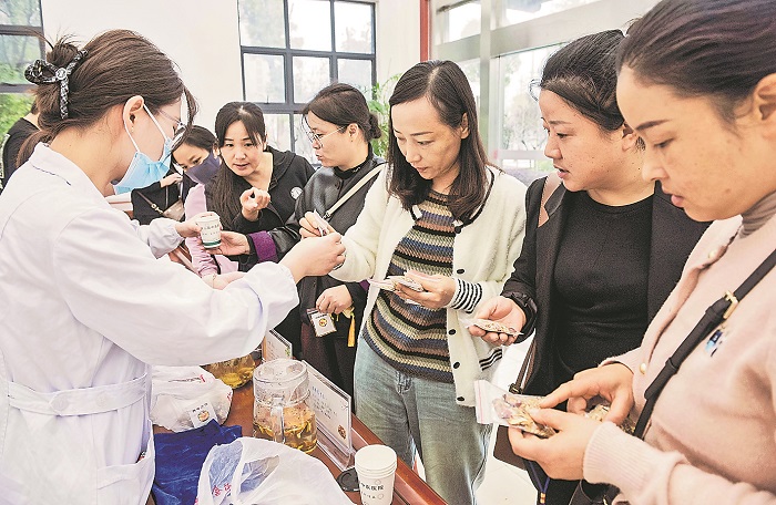近日,安徽省含山县卫生健康委联合县中医院开展“走近中医 走进中医”活动,吸引众多市民参与。活动中,市民们品尝了养生中药茶饮,并亲手制作传统特色香囊。专业中医师现场把脉问诊,解答市民健康疑惑。本报通讯员 欧宗涛 摄