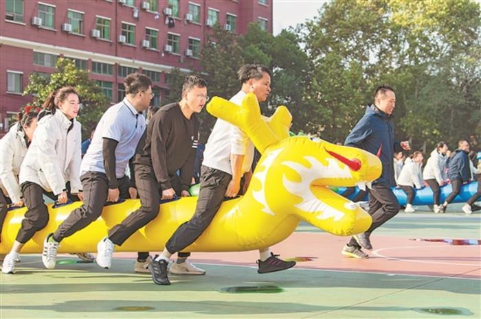11月24日,浙江省金华市第一中等职业学校运动场上,当地企业职工在进行“齐心协力向前冲”运动比赛。