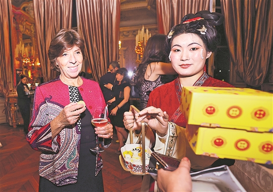 法国LA LISTE国际美食2025年度排行榜日前在位于巴黎的法国外交部举行揭榜仪式。来自法国、葡萄牙、中国、韩国、日本等国的主厨在现场展示其独家美食。LA LISTE国际美食榜单于2015年由法国人首创,如今已收录来自全球200多个国家和地区的超过3.5万家餐厅。图为近日,在位于巴黎的法国外交部举行的LA LISTE国际美食榜单揭晓活动现场,法国前外长卡特琳·科隆纳(左)品尝来自中国北京的百年宫廷“仿膳”名点。新华社记者 高静 摄