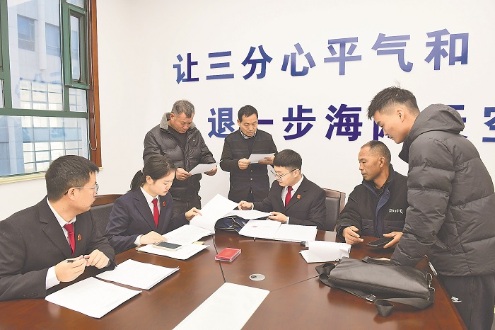 11月26日上午,安徽省宿州市埇桥区人民法院,执行法官为来自安徽省亳州市的66名农民工代表办理60余万元欠薪领取手续。入冬以来,宿州市埇桥区人民法院对农民工工资、赡养抚养、交通肇事、婚姻家庭等涉民生案件开启快立、快审、快执“绿色通道”,缩短审判与执行周期,让申请执行人感受到浓浓的司法温暖。本报通讯员 阮传宝 摄