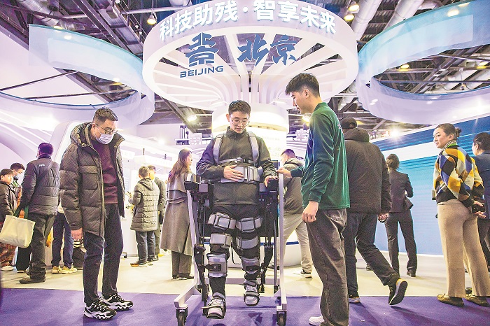 本届博览会主题是“科技赋能,共享福祉”。展会规模达22000平方米,吸引了300余家国内外企业、机构参展,全方位展示涉及残疾人、老年人等功能障碍群体的衣、食、住、行、用、医、学、娱等方面的创新辅助器具产品和服务解决方案。图为观众体验外骨骼机器人。本报记者 蔚可任 摄