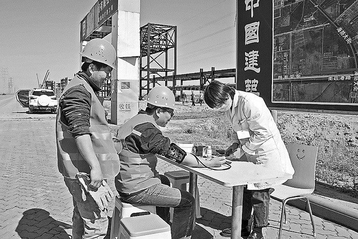图为建筑工人在医护人员帮助下使用流动简易医疗箱监测血压,保证健康上岗。本报通讯员 纪永奇 摄