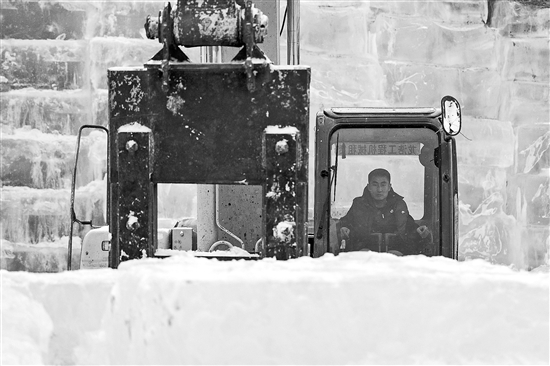 11月26日,在哈尔滨冰雪大世界存冰场,工人将冰块装车。