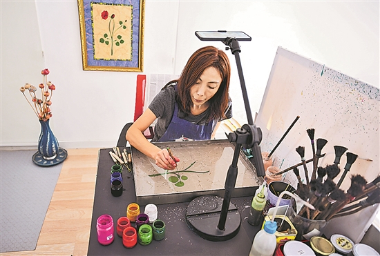 土耳其水拓画是一种“水上作花、纸拓成画”的古老绘画技艺,2014年被联合国教科文组织列入世界非物质文化遗产名录。2007年,在西安长大的李昕桐定居土耳其伊斯坦布尔,并开始学习水拓画。她不断尝试将水拓画与中国元素相结合,将水拓画拓在中式服饰、丝扇、丝巾上,将丝路驼铃、粽子、龙、福字等图案做成水拓画,并将作品展现给土耳其民众。近年来,她时常往返中国和土耳其,开展讲座和培训,在中国传授水拓画技艺,为增进中土两国文化交流而努力。图为近日,李昕桐在土耳其伊斯坦布尔的家中绘制水拓画。