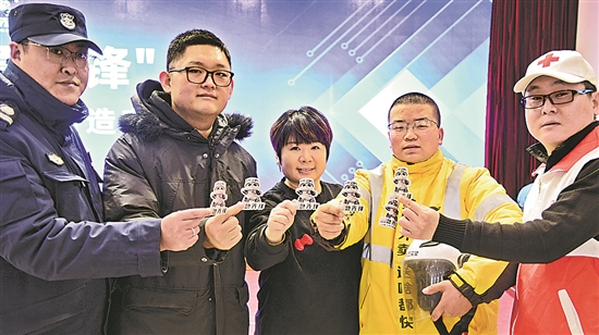11月28日,望京街道应急救援队的志愿者展示他们的“望京急先锋”标牌。