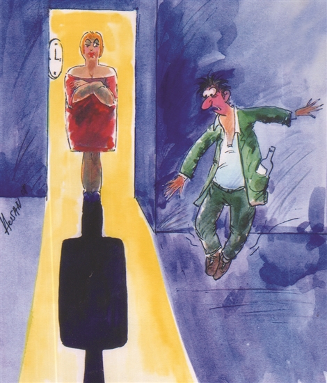 酒鬼大醉狼狈归来,走到家门口顿时清醒。他想到妻子的横眉冷对,孩子不屑的轻蔑,尤其是那根令人畏惧的擀面杖……