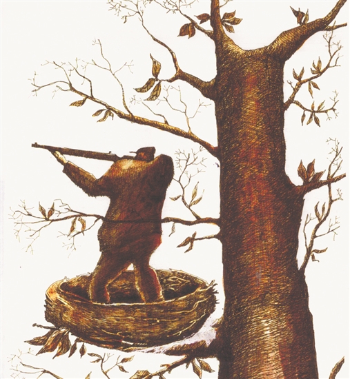 “鸠占鹊巢”的猎人仍不歇手追杀可怜的鸟儿。乐极生悲的事儿找上门来了——贪婪射手占据的大树正在断裂,其后果可想而知。