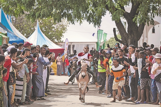近日,第22届拉穆文化节在肯尼亚东部印度洋拉穆群岛上的拉穆古镇举行,活动期间有骑驴、独桅三角帆船、少年游泳等比赛以及传统手工艺品展、传统音乐舞蹈表演等,旨在展示和弘扬东部非洲斯瓦希里传统文化。拉穆是斯瓦希里文化发源地和保存最完好的地区之一,2001年被联合国教科文组织列入世界文化遗产名录。图为近日,在肯尼亚东部印度洋拉穆群岛上的拉穆古镇,当地居民在拉穆文化节上进行骑驴比赛。新华社记者 韩旭 摄