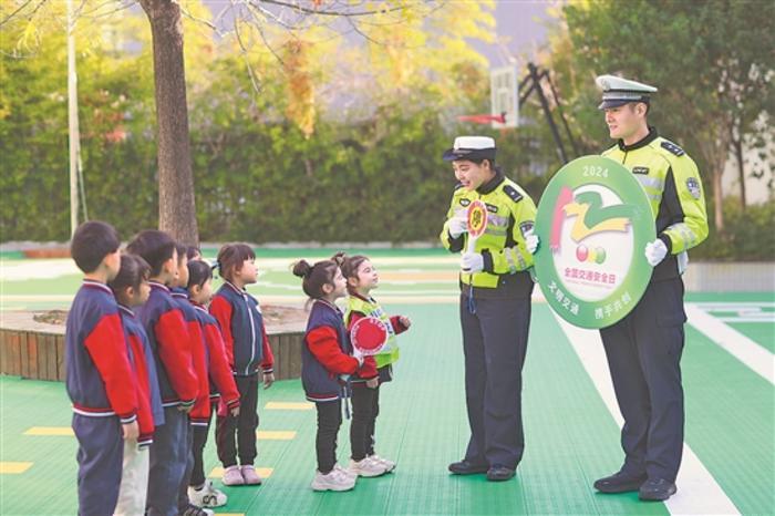 12月2日,在江苏省兴化市昭阳湖幼儿园,交警为小朋友们讲解交通安全知识。当日是第十三个“全国交通安全日”,各地学校开展交通安全主题活动,提高师生的交通安全意识和自我保护能力。新华社发(周社根 摄)