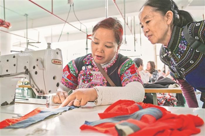 12月1日,元阳县德熙纺织厂成品生产车间组长刀秀琼(左)在由当地闲置停车场改造的生产车间里指导新员工工作。