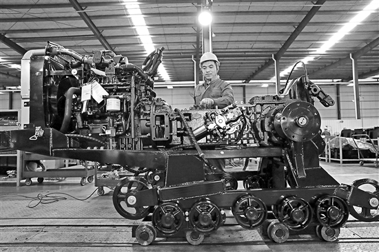 11月29日,在湖南郴州的农夫机电有限公司车间里,工人在装配一台拖拉机。