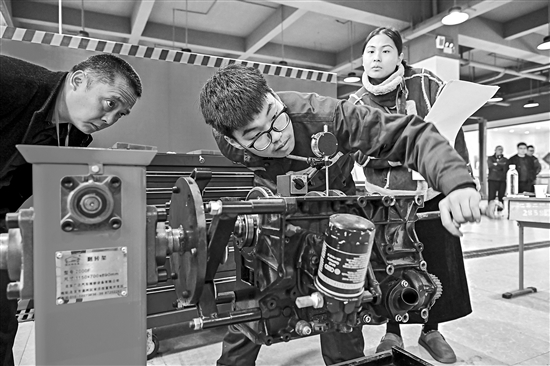 11月29日,在四川仁寿县第二高级职业中学比赛现场,参赛人员正在进行发动机曲轴检测比赛。当日,四川省眉山市第十五届职业院校技能大赛在该校举行,来自该市18所职业院校的19支代表队同台竞技,通过以赛促学,不断提升职业技能水平。潘帅 摄/中新社