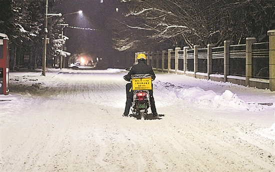 近日,黑龙江多地迎来暴雪天气,气温大幅降低。11月27日晚,记者在齐齐哈尔街头看到,一位正在送餐的外卖小哥因地面积雪,车轱辘不时打滑。雪天道路湿滑,请外卖小哥小心慢行,注意安全,也请顾客给他们多一些时间。(本报记者 曹玥 史宏宇)