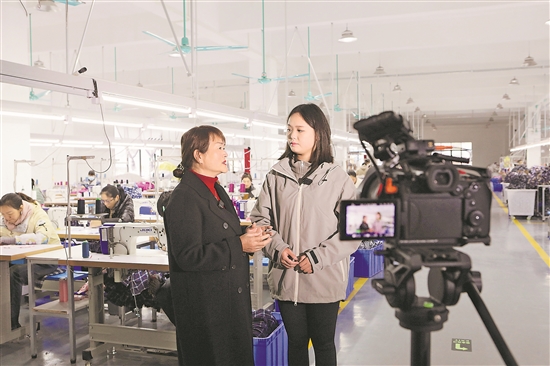 12月5日,在贵州省黔东南苗族侗族自治州施秉县一家服装企业生产车间,直播人员(右)和人社部门工作人员在线上向求职者介绍岗位信息。