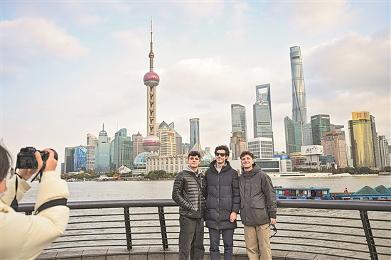 12月4日,来自西班牙的游客在上海外滩拍照留影。