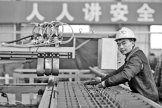 12月2日,工人在渝昆高铁云南段昭通制梁场内作业。