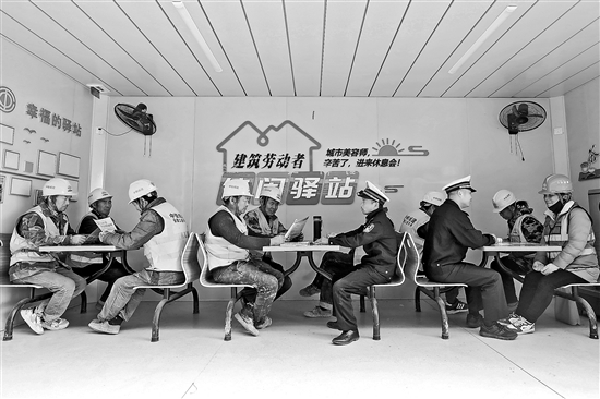 12月4日,在湖南省长沙市岳麓区的一处建筑劳动者休闲驿站内,来自中铁城建集团项目部的工友们利用休息时间,向前来普法的民警、辅警咨询法律问题。