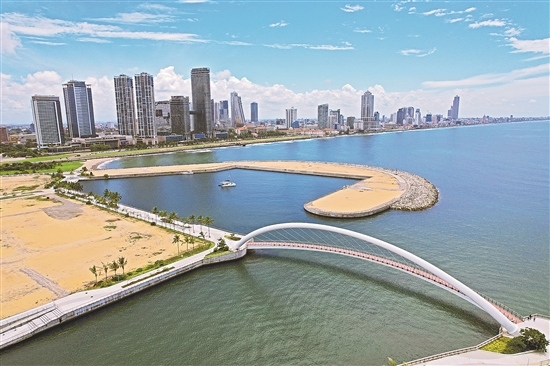 从斯里兰卡首都科伦坡高空俯瞰,一道3.7公里长的半圆形人工堤坝如同手臂,环抱着科伦坡港口城的海岸,这道防波堤以里仿佛一座散布着珊瑚和鱼群的“海底花园”。防波堤采用经中国技术改良后独特的“扭王字块”设计,为珊瑚提供了完美的附着表面,使珊瑚在适宜的水深和光照条件下生长。图为近日拍摄的斯里兰卡科伦坡港口城景色。新华社发