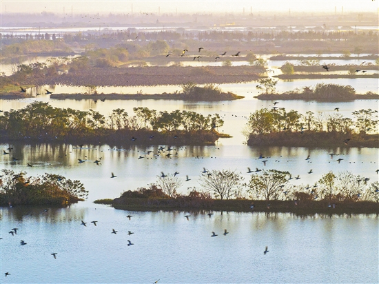 近日,大批候鸟飞抵江苏省兴化里下河国家湿地公园,它们成群结队在浅滩觅食、休憩,成为冬日里一道美丽的风景线。