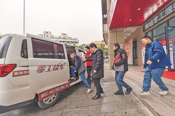12月5日,浙江省金华市婺城区零工市场门口,市场工作人员引导求职者乘上“零工快车”,直达应聘单位上岗就业。