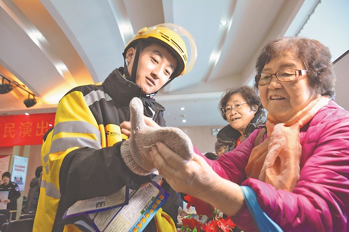 “大小合适吗?”“暖和吗?”12月4日,在天津市和平区南营门街文化活动中心,82岁的志愿者张凤兰(右一)老人将自己新织的手套送给了一名外卖小哥。