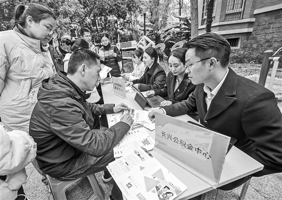 近日,浙江省湖州市住房公积金管理中心长兴县分中心工作人员给市民们讲解公积金缴存办理知识。近年来,当地通过上门办理、驻点宣传等方式,将公积金惠企惠民政策“送货上门”,让外卖从业人员、个体工商户等灵活就业人员享受公积金政策红利。新华社记者 徐昱 摄