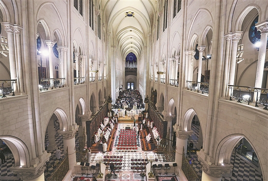 这是12月8日在重新开放仪式上拍摄的巴黎圣母院内景。法国当地时间7日和8日在位于塞纳河畔的巴黎圣母院举行仪式,庆祝2019年失火的巴黎圣母院经过5年修复后重新开放。新华社记者 高静 摄
