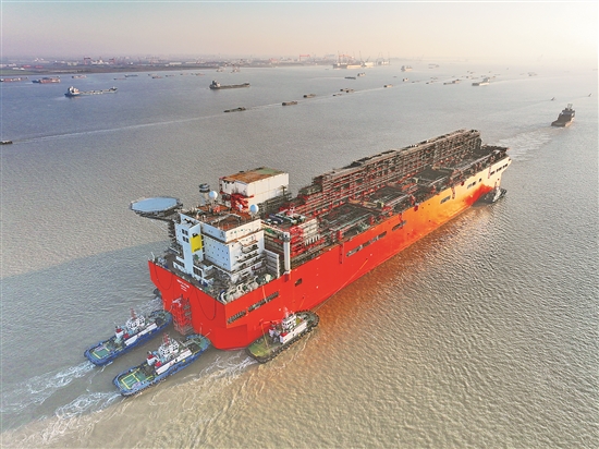 当日,我国首座大型浮式天然气液化装置“NGUYA FLNG”轮从江苏南通开发区顺利拖航出江,前往浙江舟山进行上部模块安装、集成和调试。据了解,浮式天然气液化装置(FLNG)能够在深远海直接将开采出的天然气液化并储存,是海洋工程装备中建造复杂、附加值大的一类产品。