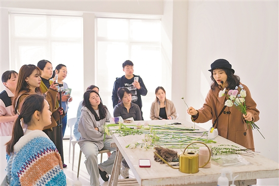12月8日,在云南昆明某花卉公司,花艺师向学员讲解花束制作方法。