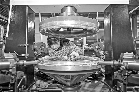 12月6日,在天津市武清区王庆坨镇利雅得公司,工人在车间内操作机器生产自行车零部件。